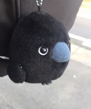 青緑色のボールチェーンのついた手のひらサイズのカラスのぬいぐるみです。