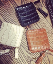 白のクロコダイル柄で二つ折りのジッパーが付いた財布です。(写真記載)