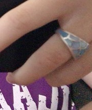 鱗のような模様が入った少し大きめの水色と銀の指輪です。