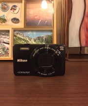 ニコン黒デジタルカメラクールピクスS7000、モンベルゲイター、青い防水巾着