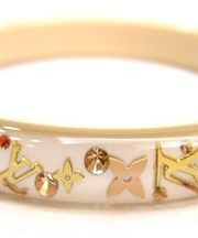 ブランドはルイヴィトンで、薄ピンク色。樹脂でできたバングルで中にロゴやストーンがちりばめられている可愛いものです。