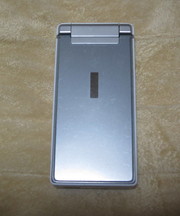 SoftBankのシルバーのガラケー 黒の革ケース入り