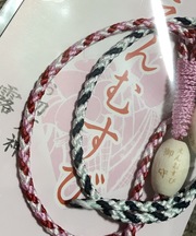 ピンクと赤のミサンガで、えんむすびと書いた木のようなものがついています。