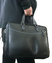 かばんは、黒で古タイヤを再利用した手提げかばんです。