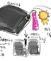 黒い合皮の財布で、アニメ「あの花」のラバーストラップ3つ(こけし、ライオン、ピンク色で白い花柄が散りばめられた輪っか状のもの)をつけていて、