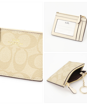 COACHのロゴが入った白とベージュのパスケース/コインキーケースで、少しのコインや小物が入れられるファスナーの中に、アクセサリーが入っています。画像のものは全く同じではないのですが、同じ形です。