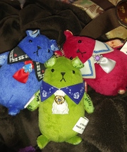落としたのは3つのうち青いぬいぐるみです。水色のスペードの飾りがついた赤い首飾りをしております。