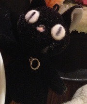 特徴:黒猫、タバコの箱くらいの大きさ、頭にストラップをつけてあります。