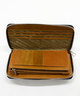 緑色系のリュック、中に茶色のプラダの長財布、タブレット機器等