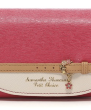 サマンサタバサの赤い二つ折り財布で、茶色のラインが入っており、小さな花のチャームが付いています。