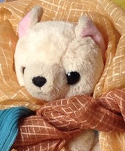 この移動中のどこかで、体長15センチほどの小さな白い犬のぬいぐるみを落としてしまいました。首まわりはグレーの毛になっています。キャラクターではありません。