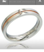 シルバーの指輪で、中央に薄ピンクの彫った線が入っており、小さなダイヤモンドが1つ埋め込まれています。