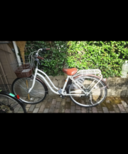 カゴが特徴的で、カゴの下の部分が茶色い網状になっており、自転車自体は白と茶色を基調とした色となっています。