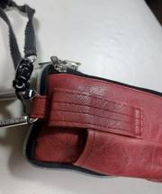 携帯端末機。えんじ色と黒の首かけのカバーに入っています。