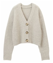 Vネックのざっくりニットカーディガンで、三つのボタンがついています。