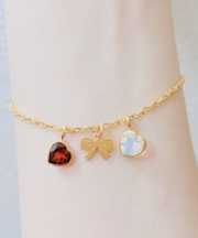 金のブレスレットです、チェーンにハートの石のチャームが二つついて赤と乳白色です。