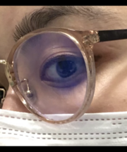 ボストンメガネ、横がブラウン系でフレームは薄いピンク系。ブルーライトをカットするのでレンズは青っぽく反射します。