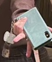 エメラルドグリーンの手帳型のカバーをつけており、Suicaと整体のカードも一緒に入ってます。