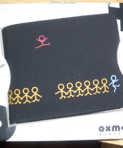 財布の特徴は、黒い二つ折りの財布で、赤、黄、水色の棒人間の柄が入ってます。