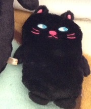 手のひらサイズの黒猫の湯たんぽを落としてしまいました。目はブルーで左を見ており、口と鼻はピンクです。
