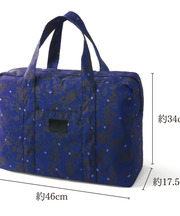 紺色にグレーで草の模様の入った、やわらかい旅行カバンです。