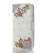 iphone6 カバーは白で花のビジューがついています。ストラップが黒い紐