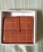 茶色の二つ折り財布で、チェック模様のステッチがあり、ROCOCOというブランドのものです。載せた画像とは全く同じではありませんが、よく似たものです。