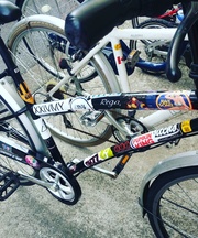 ステッカーが多くついている黒の自転車です。 かごがかかっています。